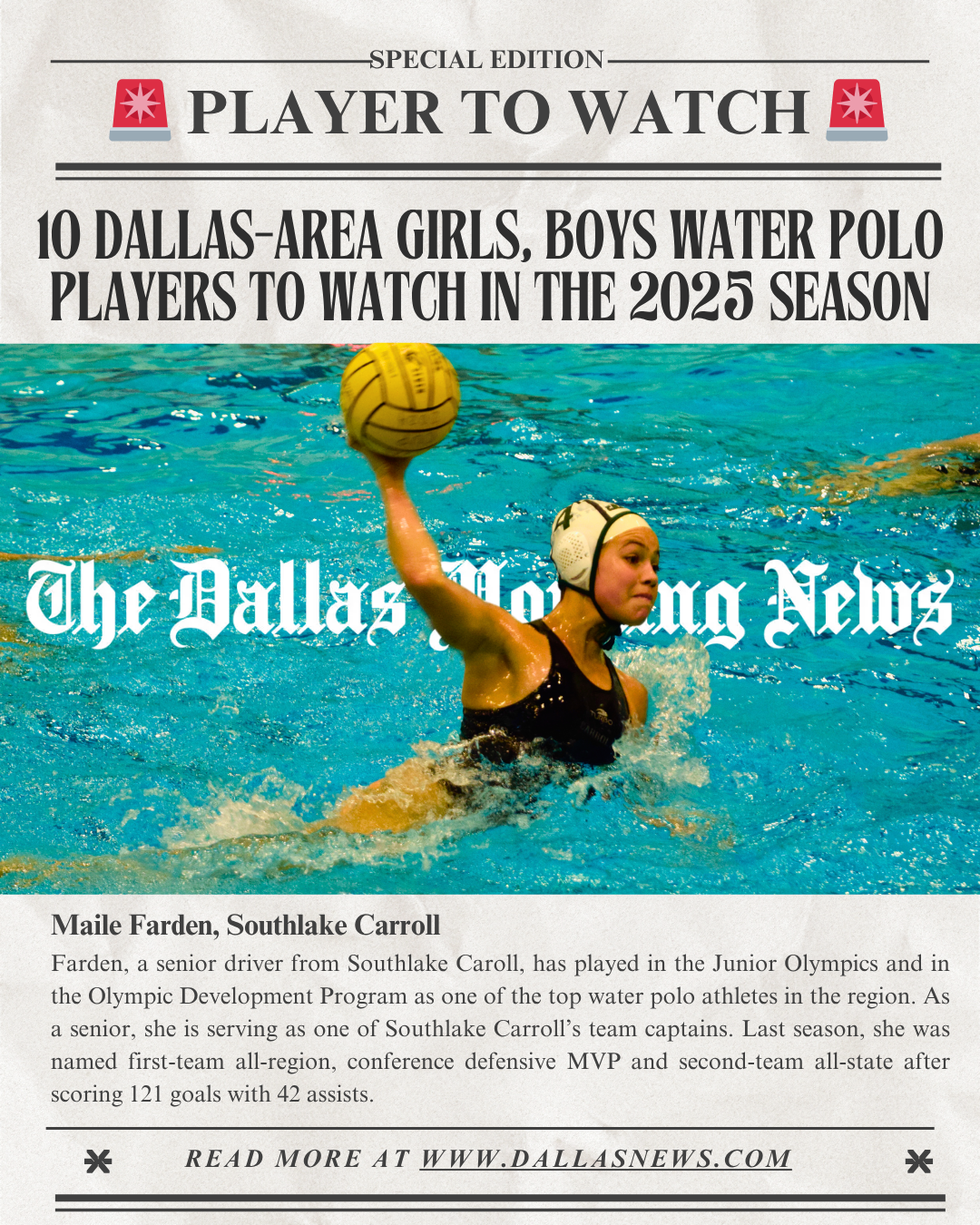 Bio: Maile Farden is a four-year standout and two-year captain in water polo for the Dragons and has secured additional varsity letters in swimming and wrestling. She has earned UIL All-District, All-Region and All-State honors and is a four-time Academic All-American with Outstanding Honors from USA Water Polo. Farden has represented Team USA in Serbia and earned First Team All-America accolades at the Junior Olympics. An AP Scholar with Distinction, she also earned National Merit for Indigenous People honors. Additionally, she received the prestigious Nick Johnson Leadership Award twice for athletes who exemplify integrity, sportsmanship and leadership.